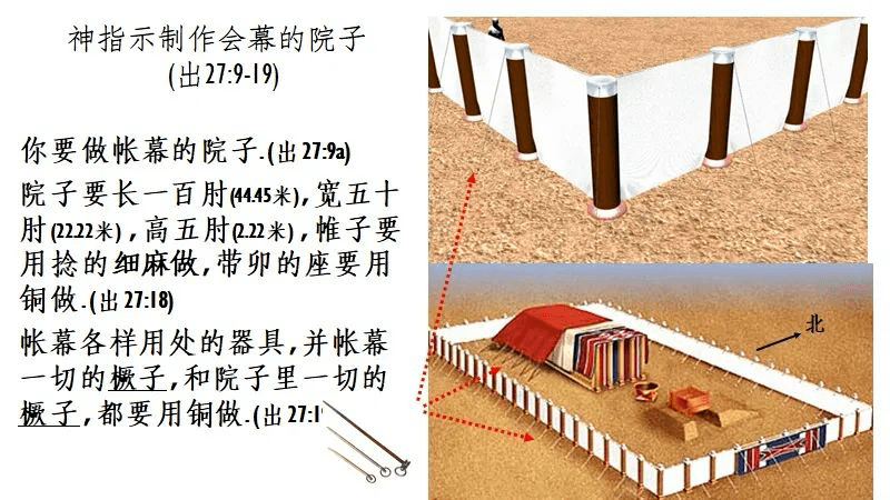 出埃及記 27:9-19:描述院子的尺寸、用料與功能,是百姓進入神面前的第一道界線。
