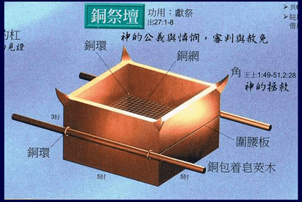 「你要用皂莢木做祭壇,長五肘,寬五肘,是四方的,高三肘。要在壇的四角上做四個角,與壇接連一塊,用銅把壇包裹。」