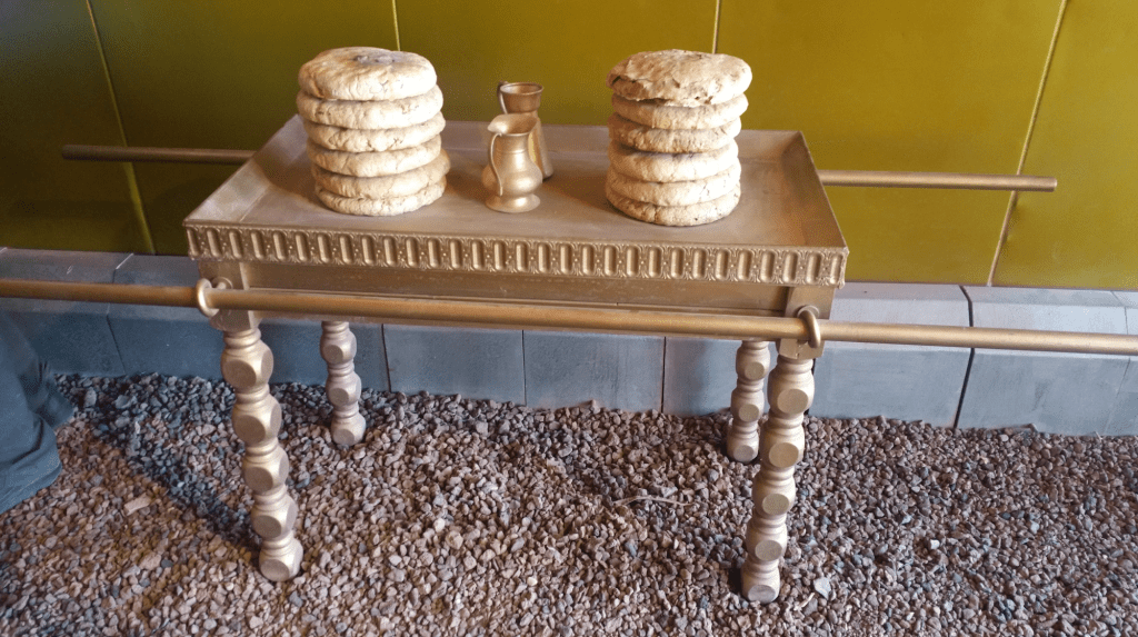神吩咐摩西建造一張陳設餅桌(showbread table),以皂莢木製成,包裹純金,放在聖所中,餅數為十二個,代表以色列十二支派,也象徵整個神的百姓都被記念在祂面前。