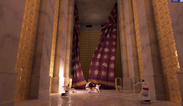「又要拿藍色、紫色、朱紅色線和撚的細麻,用巧匠的手工織幔子;幔子要懸在四根包金的皂莢木柱子上,柱子安在四個銀座上。……幔子要將聖所和至聖所隔開。」(出埃及記 26:31, 33)