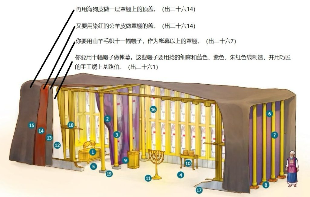 「你要用十幅幔子作帳幕,要用撚的細麻和藍色、紫色、朱紅色線製作;並要以巧匠的手工繡上基路伯……在帳幕以上蒙一層染紅公羊皮,在其以上再蒙一層海狗皮。」(出埃及記 26:1, 14)